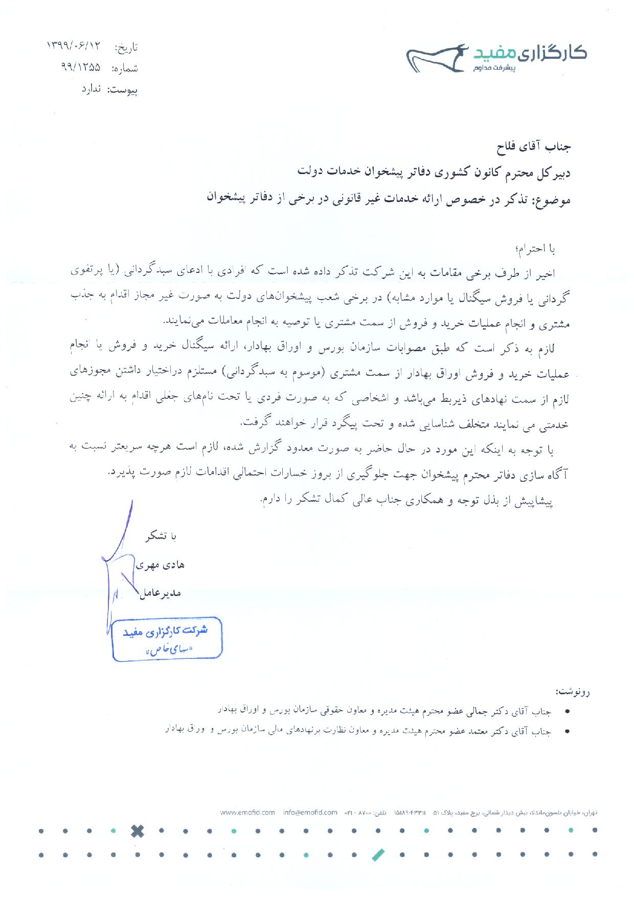 با عنایت به ضرورت ارائه خدمات مطابق روالهای قانونی و طی مراحل اخذ مجوز از نهادهای مسئول در این بخش به پیوست نامه کارگزاری مفید در خصوص اقدام به سبدگردانی یا فروش سیگنال از سوی بعضی از دفاتر گزارش شده از سوی نهادهای نظارتی عیناً جهت اطلاع درج می گردد . شایان ذکر است در صورت اقدام هر یک از دفاتر به این امر مسئولیتهای ثانویه و در نهایت پاسخگویی به کمیته تخلفات استانی و کشوری و همچنین جرائم و عواقب متناسب از سوی مراجع نظارتی بعهده دفاترخاطی خواهد بود لذا اگر چه در حال حاضر مصداقی ارسال نشده، ضرورت دارد تا دفاتر در این خصوص دقت لازم را مبذول داشته و از حیثیت صنفی خود صیانت نمایند.
