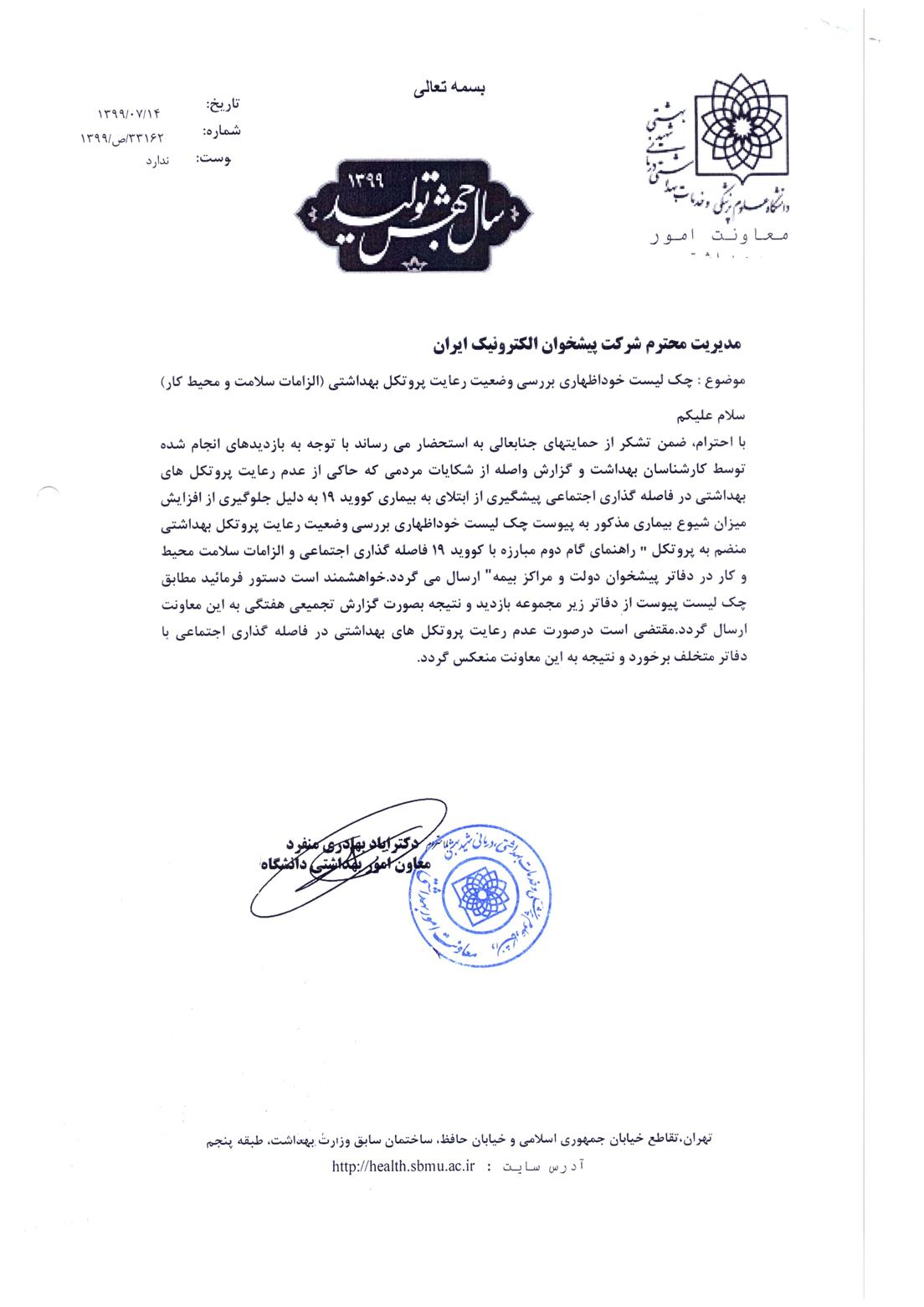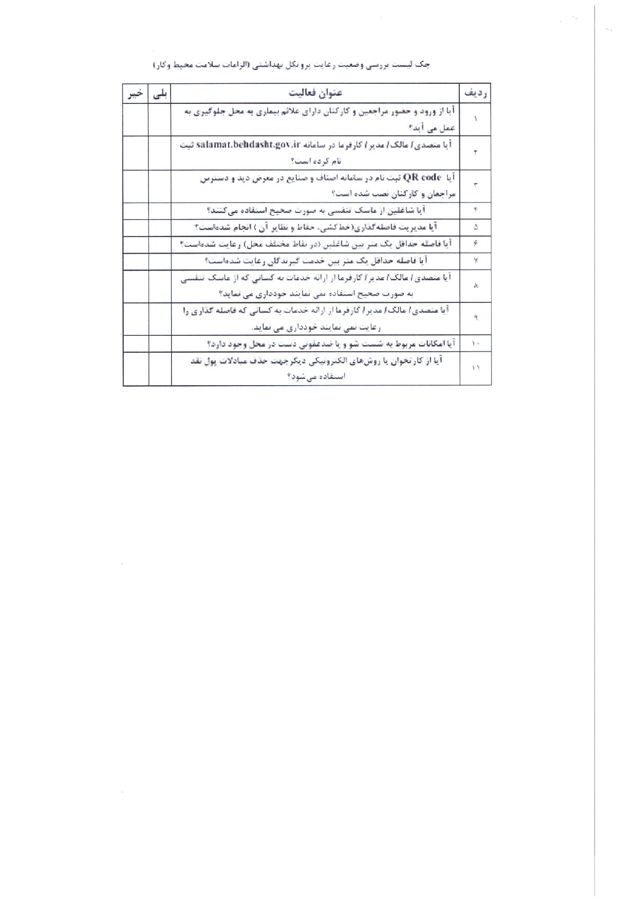 به اطلاع کلیه دفاتر محترم میرساند با توجه به افزایش میزان شیوع کرونا ، چک لیست خوداظهاری بررسی وضعیت رعایت پروتکل های بهداشتی به مطابق عکس پیوست می باشد . لازم به ذکر است عدم رعایت پروتکل های بهداشتی می تواند عواقب برای دفاتر داشته باشد .