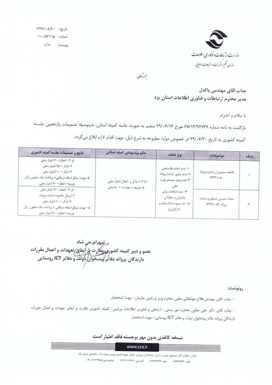 تصمیمات صورتجلسه یازدهمین کمیته کشوری استان یزد به تاریخ 99/07/30