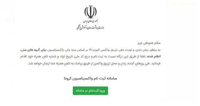 با ورود به سامانه و در صفحه اول آن اعلام شده که” به منظور زمان بندی و نوبت دهی تزریق واکسن کووید -۱۹ بر اساس سند ملی واکسیناسیون برای گروههای سنی اعلام شده، لطفاً از طریق این درگاه نسبت به ثبت نام و درج کد ملی، تاریخ تولد و شماره تلفن همراه خود اقدام فرمائید. طی روزهای آینده، زمان و محل تزریق واکسن از طریق پیامک به تلفن همراه شما ارسال خواهد شد. “