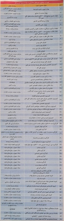 وزارت دادگستری، وزارت نیرو، پارک فناوری پردیس، مرکز ملی رقابت، ستاد مبارزه با قاچاق کالا و ارز، وزارت امور خارجه، وزارت کشور، سازمان بازرسی، سازمان صنایع کوچک و شهرکهای صنعتی، کمیسیون اقتصادی هیات دولت، سازمان بورس و اوراق بهادار، سازمان حفاظت محیطزیست، گمرک و معاونت برنامهریزی و نظارت راهبردهای ریاستجمهوری نیز هر کدام یک کارگروه را تشکیل دادهاند.