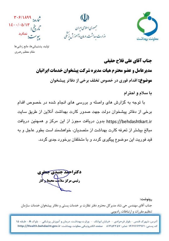 با عنایت به نامه ارسالی از سوی رئیس محترم مرکز سلامت محیط و کار وزارت بهداشت در خصوص سایت behdashtkart.ir (تصویر پیوست ) به اطلاع تمامی مدیران محترم دفاتر می رساند با توجه تاکید وزارت بهداشت در این خصوص دفاتر متخلف حسب هماهنگی با سازمان تنظیم مقررات به کمیته تخلفات استانی معرفی می گردند .