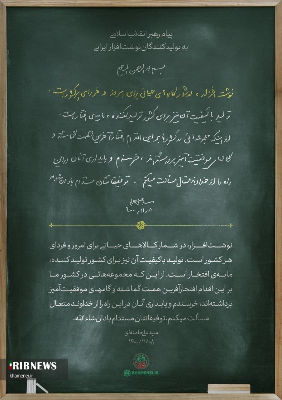 حضرت آیتالله خامنهای در پیامی با ابراز خرسندی از اقدام افتخار آفرین تولیدکنندگان نوشتافزار ایرانی، تولید با کیفیت این محصول را برای هر کشوری مایه افتخار دانستند.
