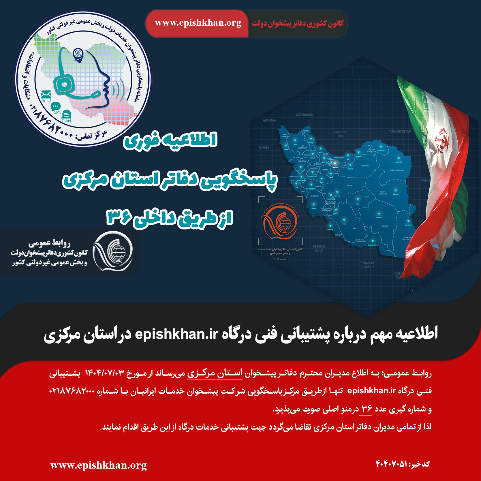 به اطلاع کلیه مدیران محترم دفاتر پیشخوان خدمات دولت در استان مرکزی میرساند، از تاریخ 1404/07/03 پشتیبانی فنی درگاه epishkhan.ir صرفاً از طریق مرکز پاسخگویی شرکت پیشخوان خدمات ایرانیان به شماره تماس ۸۷۶۸۲۰۰۰ و انتخاب عدد ۳۶ در منوی اصلی ارائه خواهد شد.