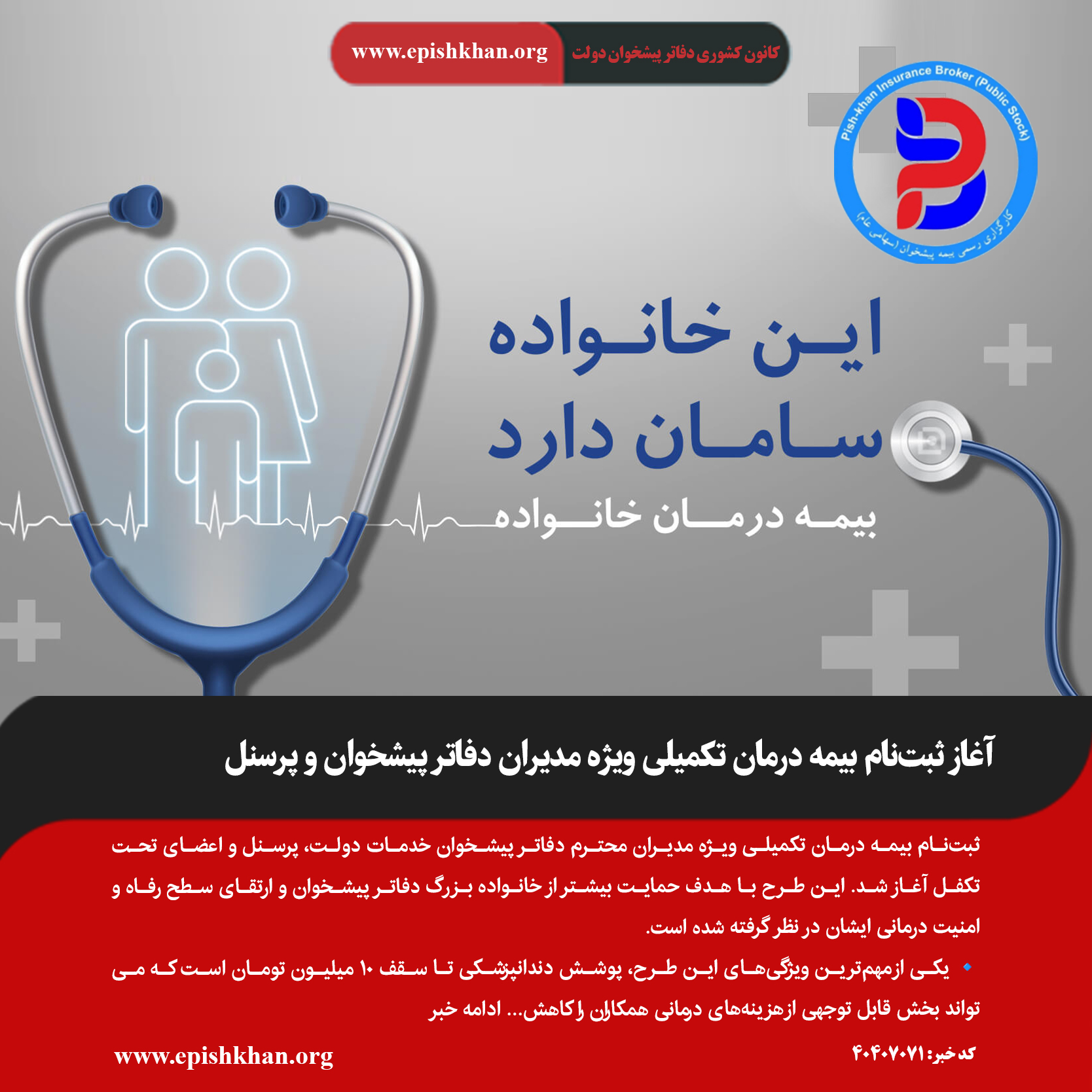 ثبتنام بیمه درمان تکمیلی ویژه مدیران محترم دفاتر پیشخوان خدمات دولت، پرسنل و اعضای تحت تکفل آغاز شد. این طرح با هدف حمایت بیشتر از خانواده بزرگ دفاتر پیشخوان و ارتقای سطح رفاه و امنیت درمانی ایشان در نظر گرفته شده است.