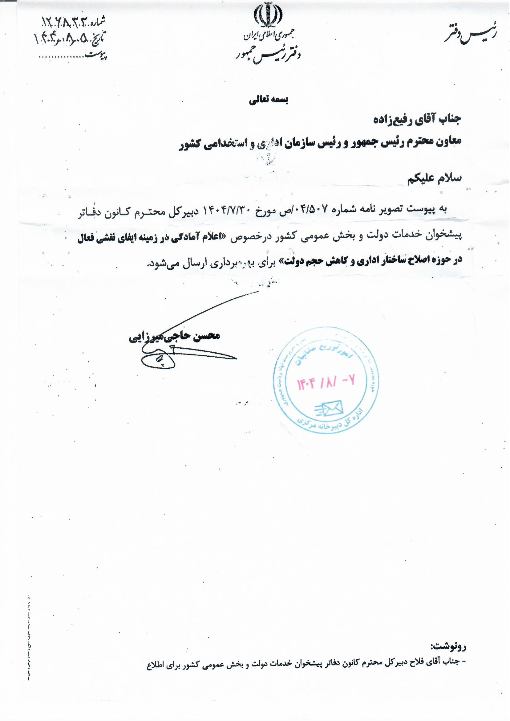در پی پیگیریهای مستمر و انجام مکاتبات رسمی از سوی کانون سراسری انجمنهای کارفرمایی دفاتر پیشخوان دولت و بخش عمومی کشور با ریاست محترم جمهوری، موضوع اعلام آمادگی کانون و شبکه دفاتر پیشخوان برای ایفای نقش فعال در فرآیند کوچکسازی دولت و جذب کارکنان دستگاههای اجرایی در قالب ساختارهای خدماترسان مردمی مورد توجه قرار گرفت و بنا بر اعلام دفتر ریاست محترم جمهوری، این موضوع جهت بررسی و اقدام لازم به معاونت محترم رئیسجمهور و ریاست سازمان اداری و استخدامی کشور ارجاع شده است.