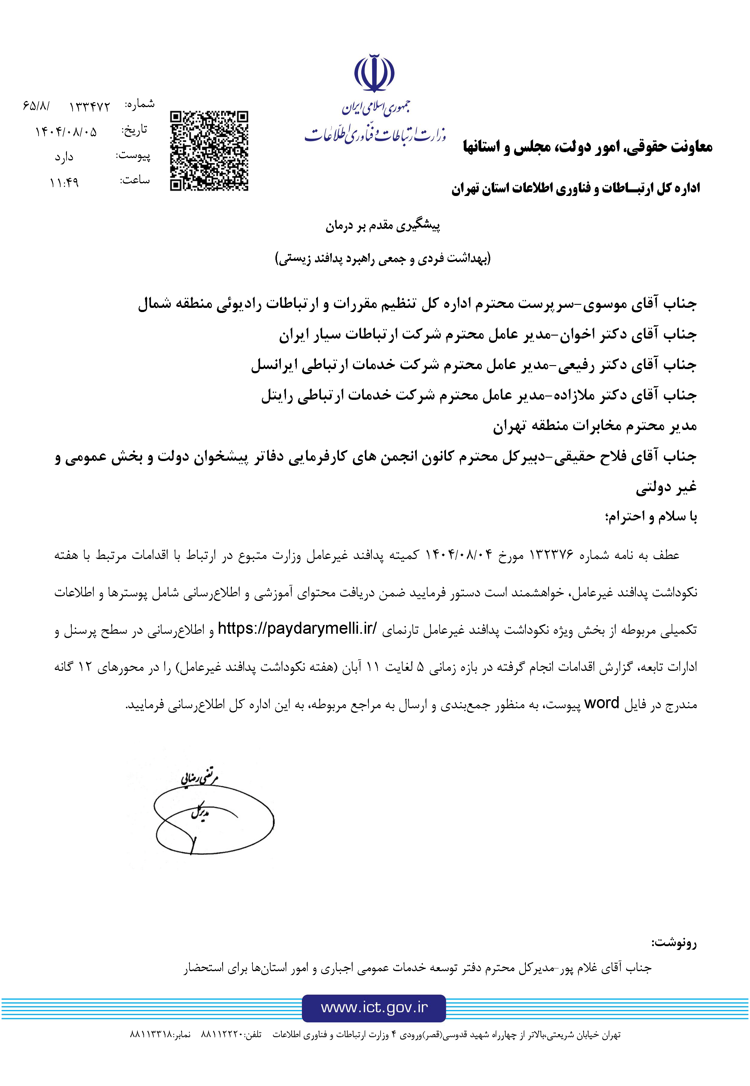 درخواست شده است نسبت به دریافت محتوای آموزشی و پوسترهای رسمی از بخش ویژه نکوداشت پدافند غیرعامل سامانه پایداری ملی به نشانی: paydarymelli.ir اقدام و ضمن اطلاعرسانی گسترده در سطح کارکنان و ادارات تابعه، گزارش نهایی فعالیتهای انجامشده را مطابق محورهای دوازدهگانه پیوست، به ادارهکل ارتباطات و فناوری اطلاعات استان تهران ارسال کنند.