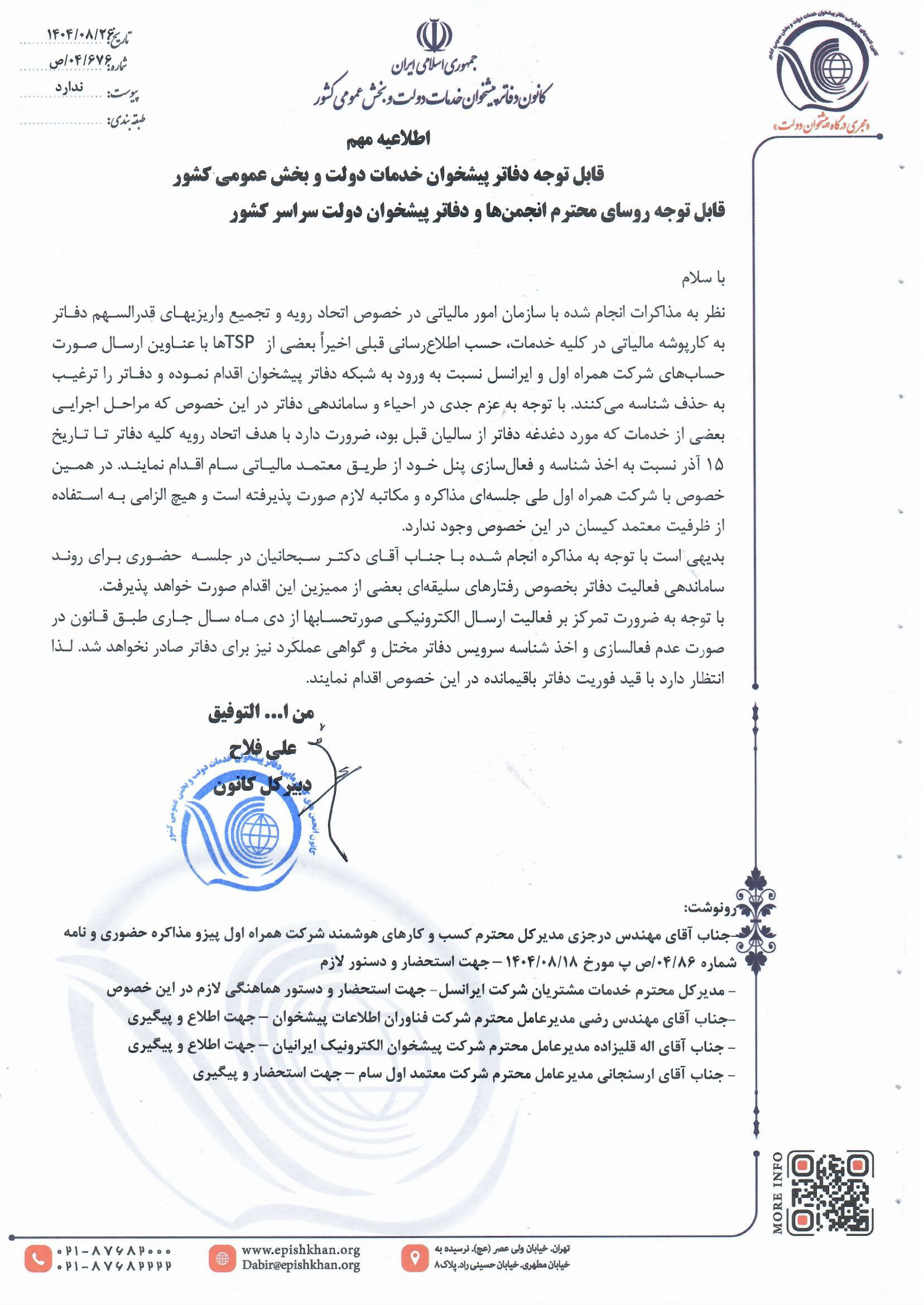 نظر به تغییرات انجام شده با سازمان های اطلاع رسانی در خصوص اتحاد و تجمیع واریزی های قدر بامداد از خدمات خدماتی قدردانی به کارپوشه ها. عناوین ارسال صورت حساب های شرکت همراه اول و ایرانسل نسبت به ورود به شبکه دفاتر پیشخوان اقدام و دفاتر را ترغیب به حذف شناسایی می کنند با توجه به عزم جدی در احیا و دفاتر در این خصوص که مراحل مختلف خدماتی را انجام می دهد که در رابطه با مشکلات از سالیان قبل از سالیان قبل با هدف انجام می شود. در همین خصوص با شرکت همراه اول طی جلسه ای مذاکره و مکاتبه لازم صورت پذیرفته است و هیچ الزامی به استفاده از معتمد کیسان در این خصوص وجود ندارد. بدیهی است با توجه به طرح انجام شده با جناب آقای دکتر سبحانیان در جلسه حضوری برای روند ساماندهی فعالیت های دیگر به خصوص رفتارهای سلیقه ای از ممیزین این اقدام صورت خواهد پذیرفت. با توجه به تمرکز بر فعالیت ارسال الکترونیکی صورتحسابها از دی ماه سال جاری طبق قانون در صورت عدم فعالسازی و اخذ شناسه سرویس دفاتر مختل و عملکرد نیز برای دفاتر صادر نمی شود. انتظار دارد با قید فوریت دفاتر باقیمانده در این خصوص تصمیم بگیرد.