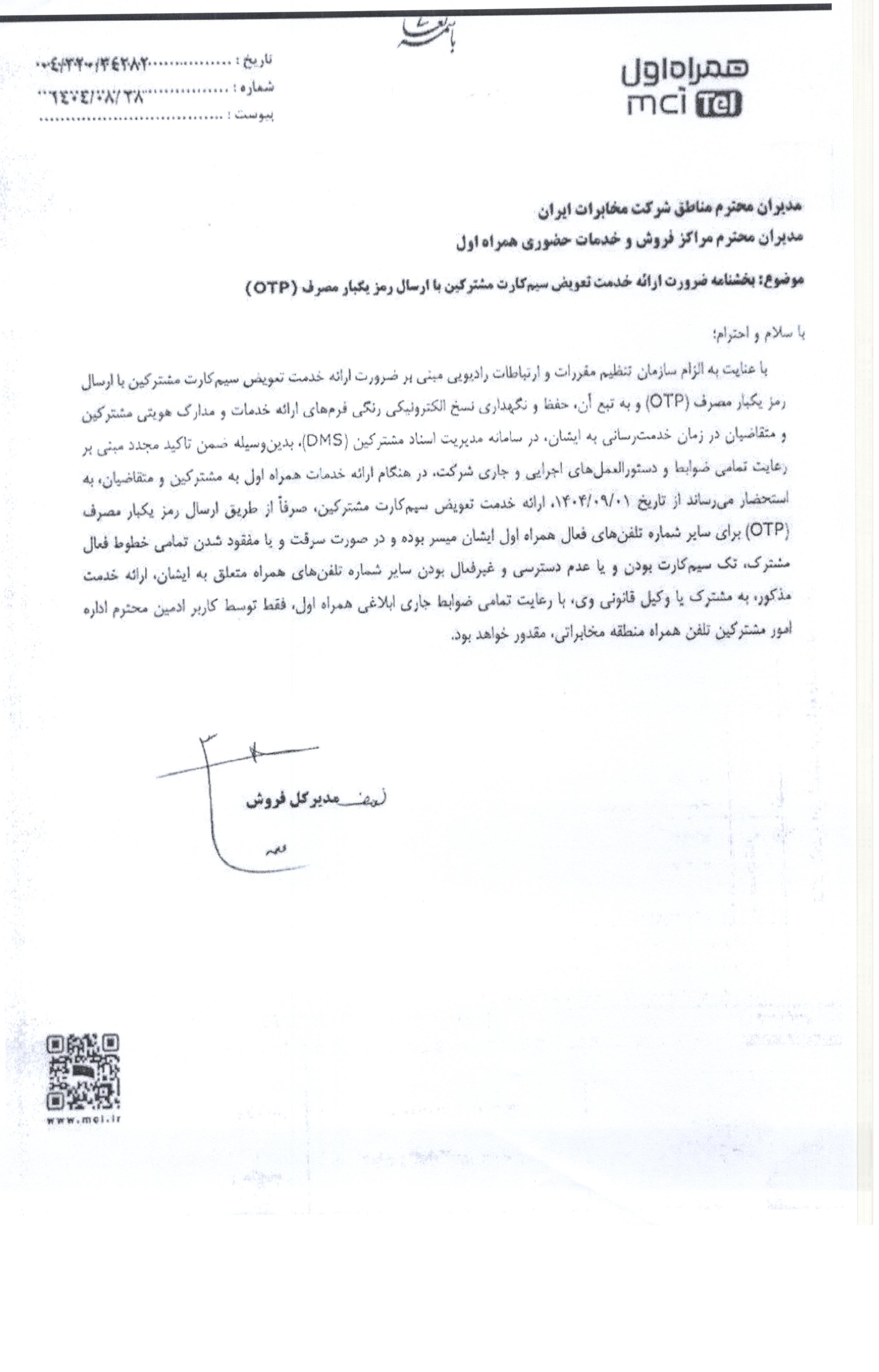 احتراماً، بازگشت به ابلاغیه مدیر کل فروش شرکت همراه اول به شماره ۰۴/۳۲۰/۳۴۲۸۲ مورخ ۱۴۰۴/۰۸/۲۸ به شبکه دفاتر پیشخوان دولت مبنی بر الزام سازمان تنظیم مقررات و ارتباطات رادیویی نظر به تعویض سیم کارتهای سوخته و مفقودی مشترکین با ارسال رمز یکبار مصرف دارد، به استحضار می رساند اجرای مصوبه مذکور از تاریخ ۱۴۰۴/۰۹/۰۱ در همان روز نخست موجب بروز مشکلات عدیده برای متقاضیان و به ویژه دفاتر پیشخوان دولت گردیده است. بگونه ای که با اجرای بخشنامه مذکور بخش قابل توجهی از مراجعات مرتبط با تعویض سیم کارت از دفاتر حذف شده و عملاً حجم مؤثر مشتریان دفاتر و درآمد مرتبط با این خدمت به طور ناگهانی کاهش یافته است. این موضوع در شرایطی رخ داده که دفاتر پیشخوان بر اساس زیر ساخت نیروی انسانی و هزینه های ثابت بخش مهمی از بار خدمات ارتباطی مردم را بر دوش میکشند و وابستگی جدی به درآمدهای ثبتی و عملیاتی دارند کاهش این درآمد بدون پیش بینی ساز و کار جبرانی موجب نارضایتی و فشار اقتصادی مستقیم بر دفاتر شده است. علاوه بر این روند جدید باعث اتلاف وقت کاربر و مشتری در دفتر گردیده زیرا در بسیاری موارد پس از طی فرآیند مشخص میشود مشترک تنها یک سیم کارت دارد و طبق بخشنامه ناچار به مراجعه حضوری به اداره امور مشترکین است و با توجه به ساعت کاری ادارات همراه اول که تا ساعت ۱۵ می باشد مشترکینی که بعد از این ساعت با مشکل مواجه شوند هیچ راهکاری برای حل مشکل خود تا روز بعد ندارند و یا بسیاری از مشترکین ساکن در روستاها و مناطق دور افتاده استان هستند. برای این عزیزان مسافرت به مرکز استان برای مراجعه حضوری به ادارات امور مشترکین با هزینه های گزاف اتلاف وقت بسیار زیاد و مشکلات ایاب و ذهاب همراه است این امر موجب اختلال در ارائه خدمت نارضایتی مشترکین و کاهش کارایی دفاتر پیشخوان که تا ساعت ۲۰ مشغول خدمت رسانی هستند نیز شده است. لذا با توجه به پیامدهای منفی ایجاد شده خصوصاً تأثیر مستقیم بر پایداری اقتصادی دفاتر پیشخوان و کیفیت خدمت رسانی در سطح استانها خواهشمند است دستور فرمایید موضوع با اولویت مورد بازنگری اصلاح فرآیند و پیش بینی روش جایگزین با سازوکار حمایتی قرار گیرد.