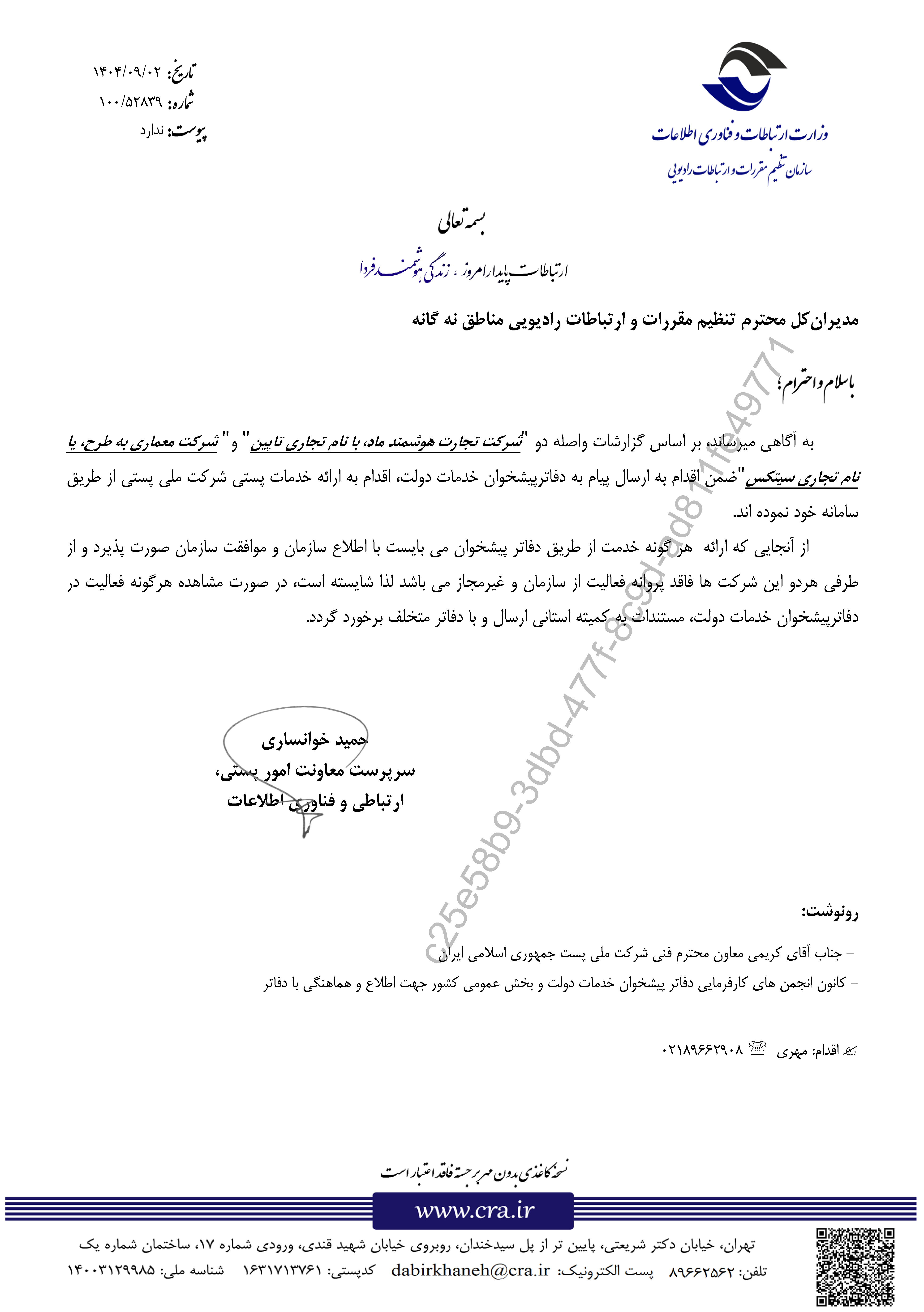 نام تجاری سیتکس”ضمن اقدام به ارسال پیام به دفاترپیشخوان خدمات دولت، اقدام به ارائه خدمات پستی شرکت ملی پستی از طریق