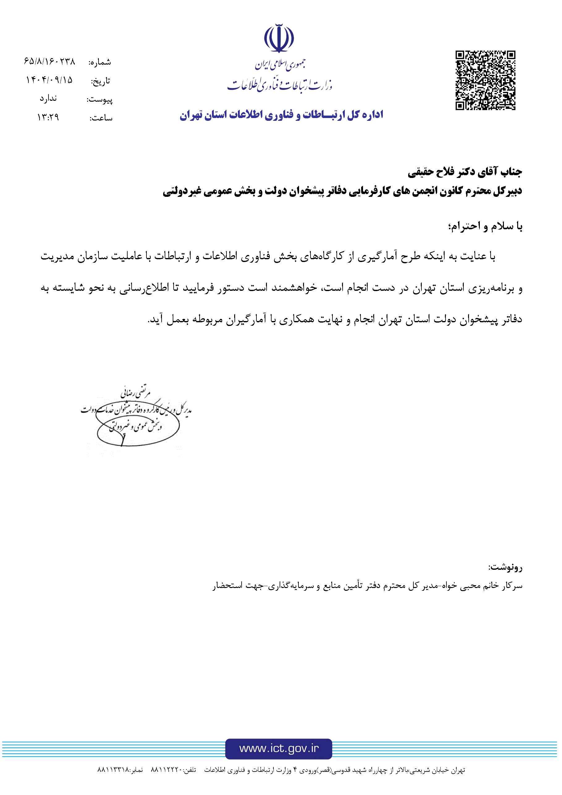 در این نامه آمده است که طرح آمارگیری از کارگاههای فعال در حوزه فناوری اطلاعات و ارتباطات با عاملیت سازمان مدیریت و برنامهریزی استان تهران در حال اجرا است و نقش دفاتر پیشخوان دولت بهعنوان بخشی مهم از زنجیره خدمات ارتباطی و فناوری اطلاعات، برای تکمیل دقیق و جامع این آمار ضروری است.