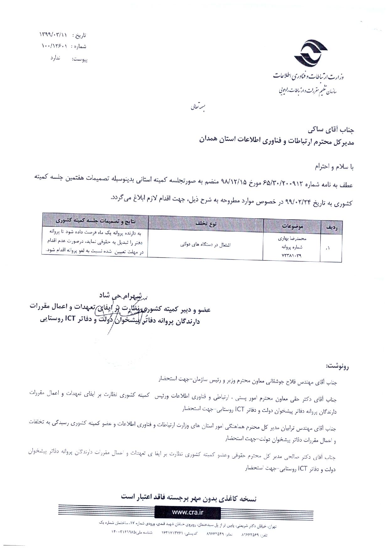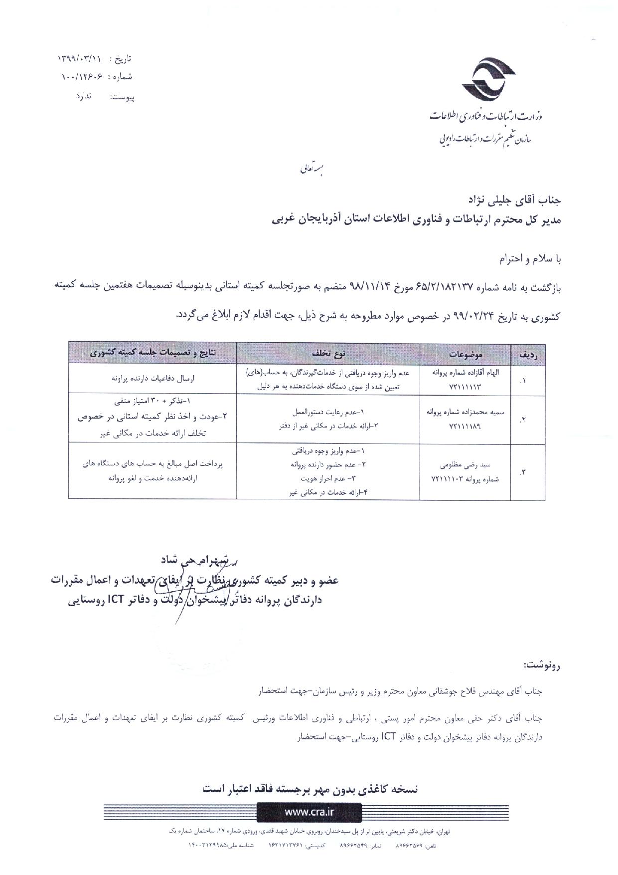 صورتجلسه هفتمین جلسه کمیته کشوری به تاریخ 99/02/24 به تفکیک استان همدان ،گلستان ،کرمان و آذربایجان غربی