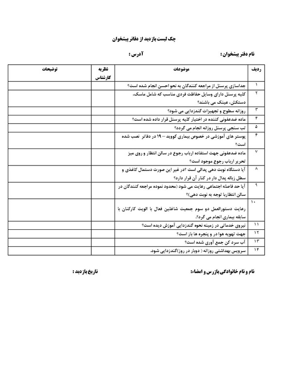 به اطلاع کلیه دفاتر محترم می رساند چک لیست کارشناسان محترم وزارت بهداشت در خصوص رعایت پروتکل های گام دوم فاصله گذاری جهت خود ارزیابی بهداشتی دفاتر به شرح زیر می باشد .